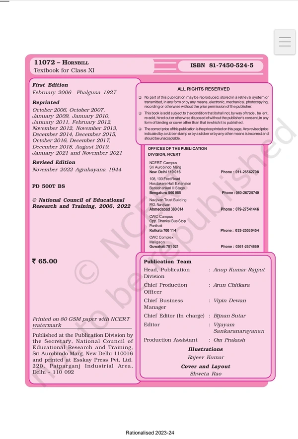 11th Class Rbse/Ncert English Subject book Hornbill (11072)