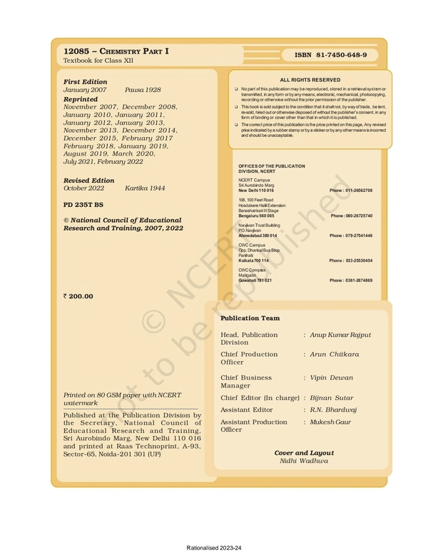 12th Class Rbse/Ncert Chemistry Part-1 book (12085)