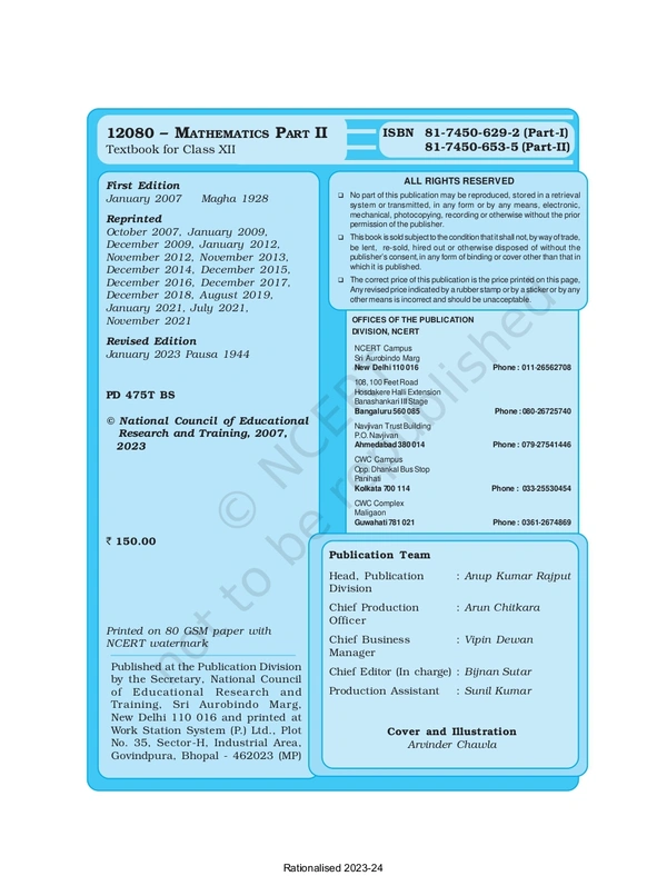 12th Class Rbse/Ncert Mathematics Part-2 book (12080)