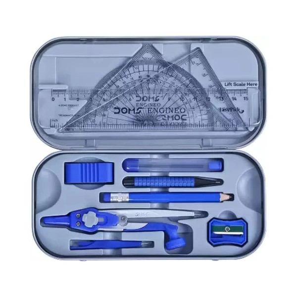 DOMS ENGINEO MATHEMATICAL INSTRUMENT BOX is whole box of a compass, divider, set square 45, set square 60, protractor 180, scale 15cm, pencil, eraser, sharpener, a lead box and a mechanical pencils.